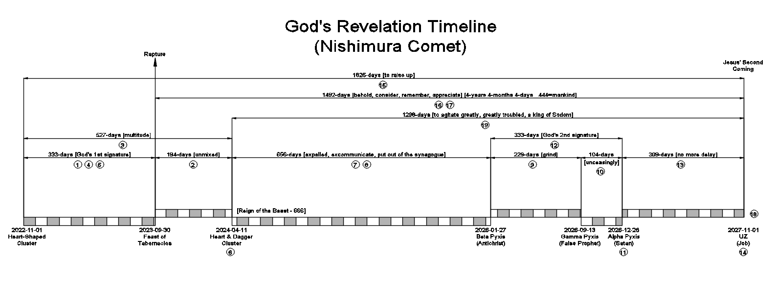 Now that we have individually studied each of the precise waypoints of the Nishimura comet, and transcribed their purpose utilizing day counts and Strong’s Concordance as a cipher, we can now compile all of the data points into God’s Revelation Timeline shown below.