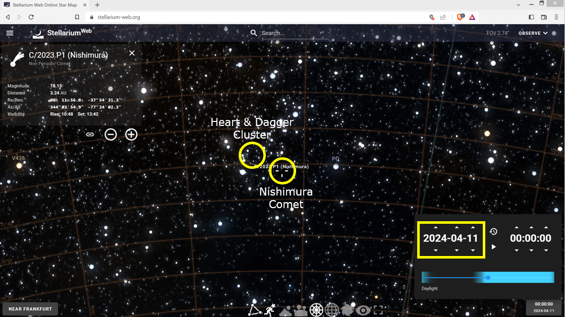 The image below zooms in closer to better see the Nishimura Comet passing the Heart and Dagger Cluster on April 11, 2024.