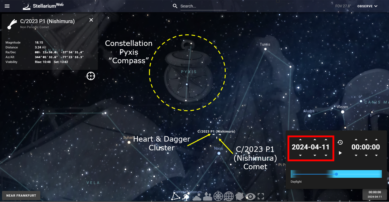 In the image below, where we are still on the same day of April 4, 2024, when Nishimura passed the Heart and Dagger Cluster, you will notice the constellation above in the yellow circle. This is the constellation Pyxis. It is known as the “compass,” which is resembled in the artwork.