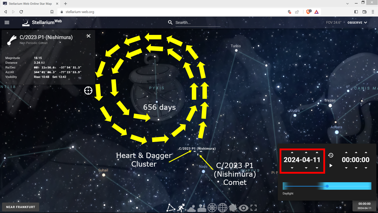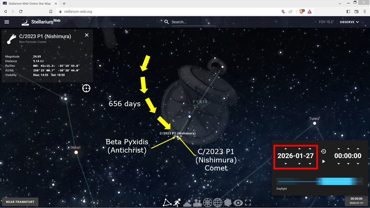 Then precisely on the 656th day, January 27, 2026, the Nishimura comet passes Beta Pyxidis, the second most significant star in the constellation. Why did Nishimura take exactly 656-days to reach the number 2 star in the constellation?